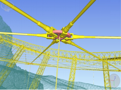 “FAST直徑500米,一度的溫度變化就會產(chǎn)生6毫米的溫度變形。一般傳統(tǒng)的結構,是采用設置溫度縫的方法來釋放溫度變形,例如,大家開車過橋的時候,會聽到咯噔咯噔的聲音,火車的鐵軌也是一樣,這些都是溫度縫在作怪。但FAST不能采用這種方案,會破壞結構的整體性。所以我們采用了一個巧妙的設計方案,巨大的環(huán)梁放在50根柱子上,在柱子和鋼梁之間放一層滑移支座,也就是說,這個巨大的鋼梁能在50個柱子上自由地熱脹冷縮,完美實現(xiàn)了溫度應力的釋放。”